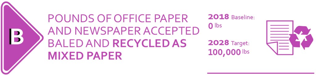 The Borough has been diverting waste from the landfill for several years. Because of the distance to market, volume generated, China’s waste import restrictions, and other factors, recycling is not currently profitable, but neither is burying waste. Nonetheless, recycling, like soccer fields, is a Borough service that residents clearly desire. Reducing consumption and waste, increasing recycling, and reusing products are all laudable goals. How much waste is being diverted from the landfill, how many pounds of paper recycled per year by the Central Recycling Facility (CRF), pounds of waste generated per resident per day, and the number of students participating in recycling education activities are very good indicators to track overall progress and revenue generation.